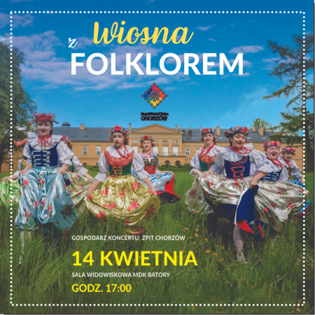 Za oknem na dobre zawitała już wiosna. Zaczęły kwitnąć pierwsze kwiaty, na drzewach zawiązały się już pąki liści, ptaki zaczęły głośniej śpiewać, a słońce częstuje nas swoimi pierwszymi ciepłymi promykami. Dlatego z wiosną w sercach Zespół Pieśni i Tańca Chorzów serdecznie zaprasza na koncert pt. „Wiosna z Folklorem”, który będzie muzyczno – taneczną podróżą po różnych regionach Polski. W czasie koncertu, wraz z publicznością przeniesiemy się do Krakowa, Lublina, a także odwiedzimy Beskid Śląski i białych górali. Podczas tej wirtualnej podróży zespół zaprezentuje również program śląski. Wystąpią wszystkie grupy zespołu. Ponieważ w miesiącu marcu powitaliśmy wiosnę, nie zabraknie również piosenek, które śpiewane były dawniej podczas obrzędu Topienia Marzanny i wprowadzania Goika. Serdecznie zapraszamy.
