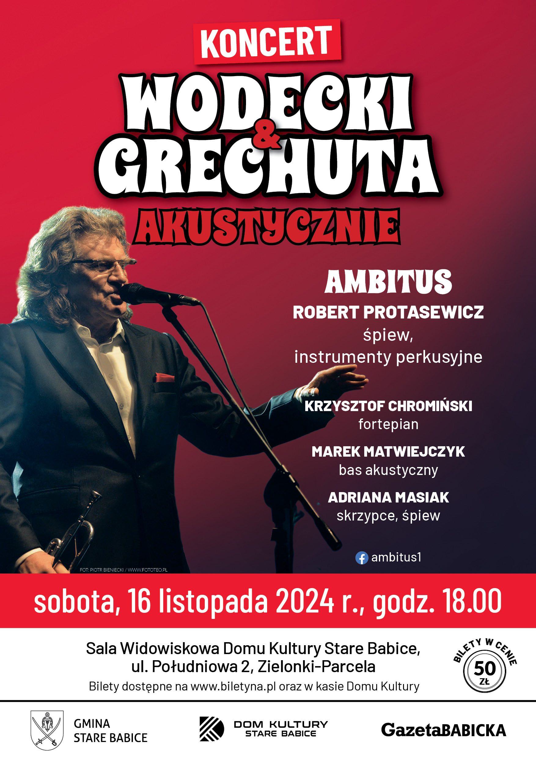 Zapraszamy na wyjątkowy koncert "Wodecki&Grechuta - akustycznie" z najpiękniejszymi przebojami dwóch wspaniałych, niezapomnianych krakowskich artystów, których twórczość uwielbiana jest przez całe pokolenia Polaków. W repertuarze nie zabraknie takich utworów jak "Zacznij od Bacha", "Lubię wracać tam, gdzie byłem", "Rzuć to wszystko co złe", czy "Nie dokazuj, "Dni, których nie znamy", "Będziesz moją Panią". "Wiosna - ach to ty".., i wielu innych. Do tego piękne teksty, m.in.: Jonasza Kofty, Agnieszki Osieckiej, Wojciecha Młynarskiego, Adama Mickiewicza, Konstantgo Ildefonsa Gałczyńskiego. Piosenki podane są niezwykle elegancko w subtelnych aranżacjach w oparciu o śpiew i instrumenty akustyczne w wykonaniu kameralnego kwartetu Ambitus w składzie: