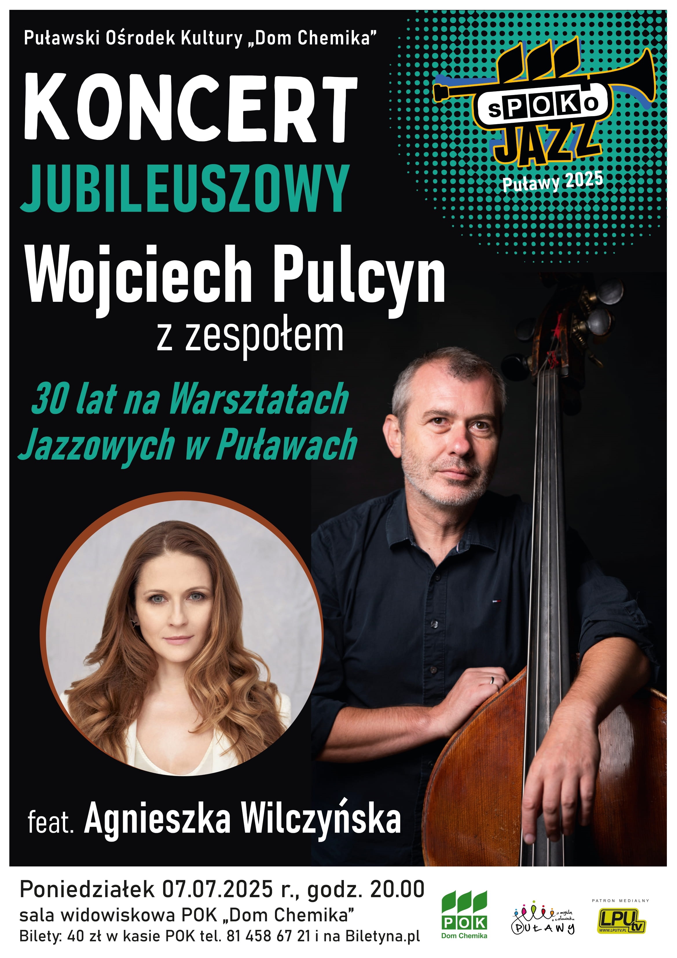 Wyjątkowy koncert jubileuszowy Wojciecha Pulcyna, który od trzech dekad związany jest z puławskimi warsztatami jazzowymi. Kontrabasiście w tym szczególnym występie towarzyszyć będzie wybitna wokalistka Agnieszka Wilczyńska, a całość dopełni zespół, w którym nie zabraknie wyjątkowych gości. Na scenie pojawią się m.in. Kuba Stankiewicz, Bogdan Hołownia, Patryk Dobosz, Kazimierz Jonkisz czy Mateusz Smoczyński.