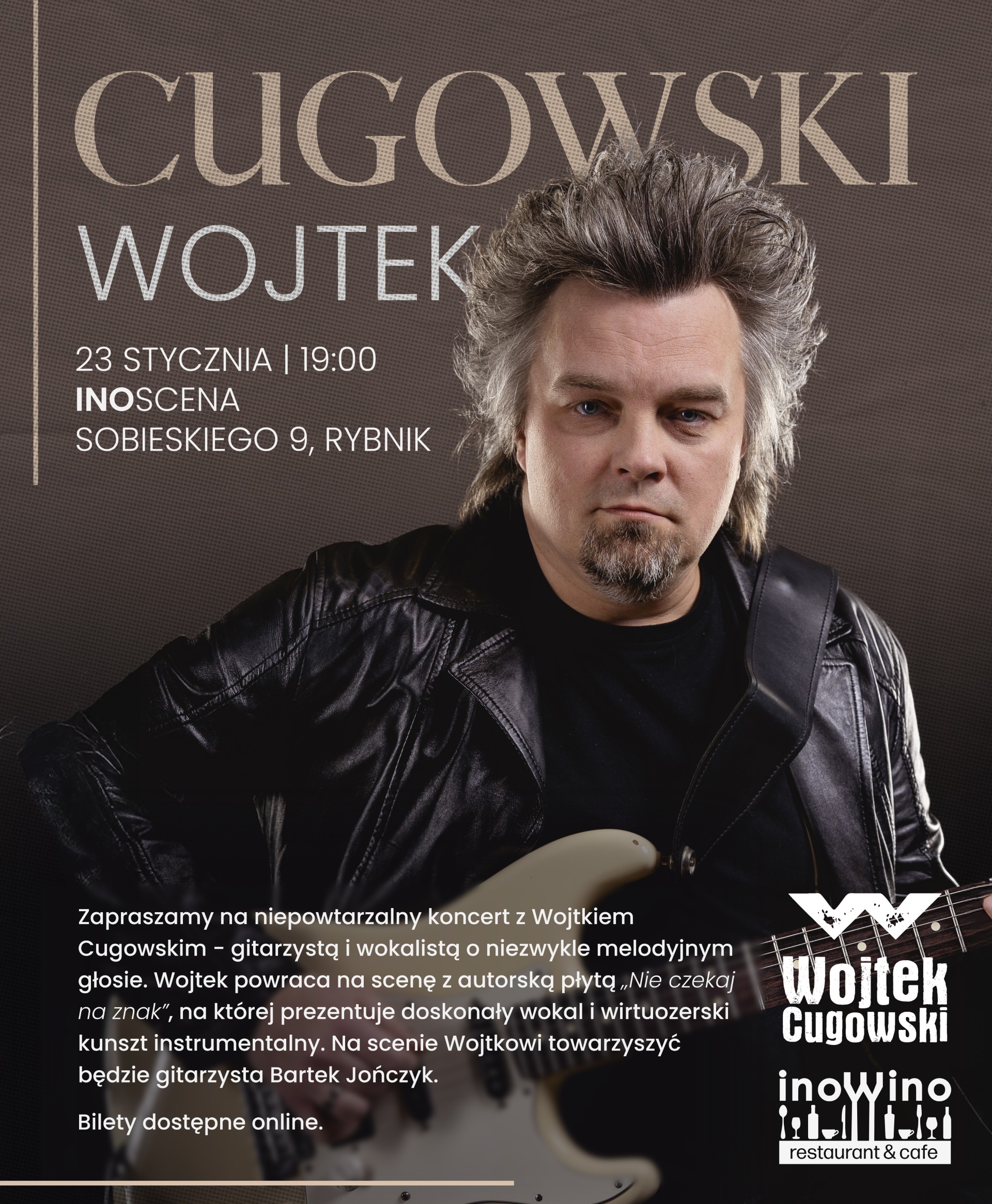Zapraszamy na niepowtarzalny koncert z Wojtkiem Cugowskim - gitarzystą i wokalistą o niezwykle melodyjnym głosie. Wojtek powraca na scenę z autorską płytą „Nie czekaj na znak”, na której prezentuje doskonały wokal i wirtuozerski kunszt instrumentalny. W programie koncertu materiał autorski z rzeczonej płyty, jak również utwory z repertuaru