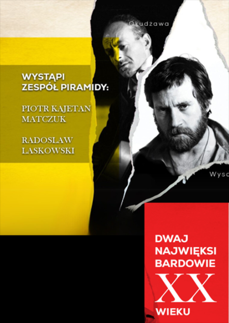 Zapraszamy na niezwykły wieczór poświęcony dwóm największym bardom XX wieku - Włodzimierzowi Wysockiemu i Bułatowi Okudżawie. Ich twórczość wpisała się na zawsze w historię i tradycję piosenki. Swoją charyzmą docierali do milionów odbiorców na całym świecie. Śpiewali na przekór ustrojowi, na przekór KGB, na przekór cenzurze. Dawali nadzieję. Na scenie zabrzmią ich największe i najpiękniejsze, także najbardziej znane przeboje. Wykonywać je będą muzycy zespołu PIRAMIDY – Piotr Kajetan Matczuk i Radosław Laskowski.