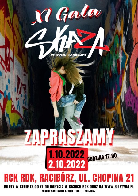 Serdecznie zapraszamy na podsumowanie roku artystycznego Zespołu Tanecznego SKAZA czyli na XI GALĘ SKAZY, która odbędzie się w dniach: 1 i 2 października br. w sali widowiskowej RCK RDK o godz. 17:00. W programie tradycyjnie prezentacje poszczególnych grupa tanecznych, pokazy solistów i duetów. Całość zostanie utrzymana w klimacie subkultury hiop-hopowej. Czyli będzie na luzie ale jednocześnie jak zawsze spektakularnie i wyjątkowo! Jak zawsze nie zabraknie niespodzianek, nie tylko tych tanecznych!