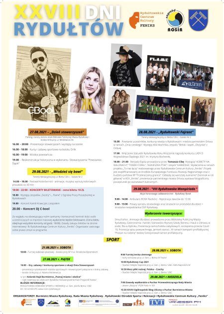 16.00 - Powitanie uczestników, konkursy wiedzy o Rydułtowach i mieście partnerskim Orlova w ramach „Dnia czeskiego”. Występy Kliki Machnika, zespołu "Bebiki i kapeli „Olszynka” z Orlovej