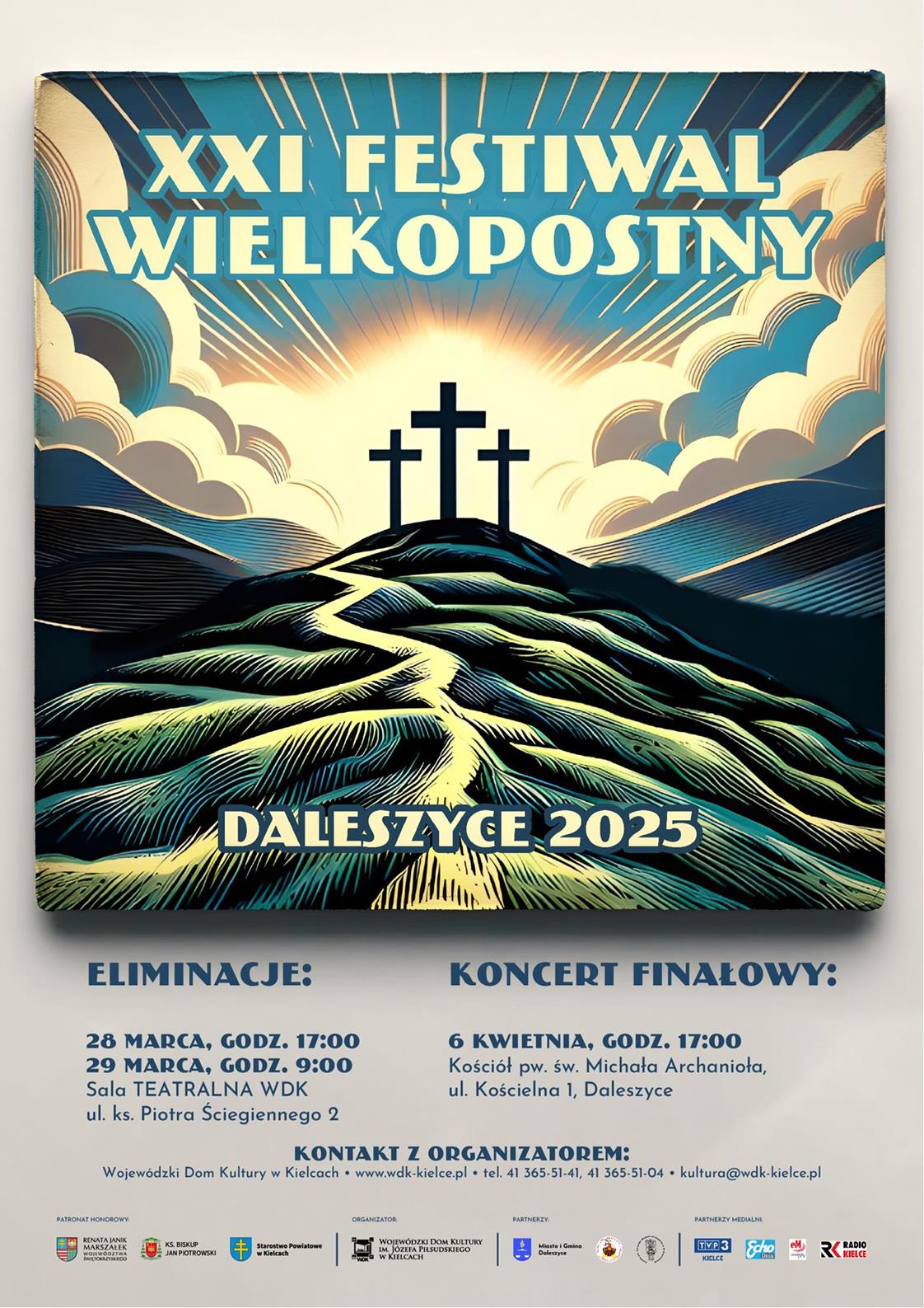 Zapraszamy serdecznie na XXI Festiwal Wielkopostny 2025! To wyjątkowe wydarzenie kulturalne, które obejmuje konkursy w kategoriach Pieśni Wielkopostne i Poezja, odbędzie się już wkrótce. Festiwal ma na celu upowszechnianie i popularyzowanie bogactwa pasyjnej muzyki kościelnej oraz skierowanie uczestników i odbiorców w stronę refleksji nad wydarzeniami wspominanymi w czasie Wielkiego Postu i Triduum Paschalnego. To także doskonała okazja do aktywizowania środowisk artystycznych.