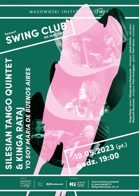 Centrum Kultury Izabelin należy do grona stałych partnerów Mazowieckiego Instytutu Kultury w realizacji projektu Swing Club na Mazowszu. 19 maja, w drugim już koncercie w tegorocznej edycji cyklu, wystąpią Silesian Tango Quintet & Kinga Rataj z programem Yo Soy Maria de Buenos Aires (Jestem Maria z Buenos Aires). Czy muzyka Astora Piazzolli może być materiałem do improwizacji? Niewątpliwie tak. W majowym koncercie przedstawiamy projekt muzyczny oparty głównie na twórczości tego wybitnego argentyńskiego kompozytora i wirtuoza bandoneonu.