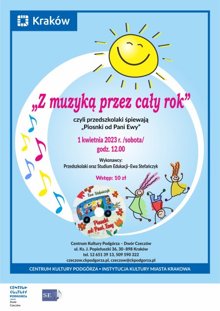 Zapraszamy na koncert Z MUZYKĄ PRZEZ CAŁY ROK, czyli przedszkolaki śpiewają "Piosnki od Pani Ewy", który odbędzie się w sobotę 1.04.2023 o godz. 12.00 w Dworze Czeczów.