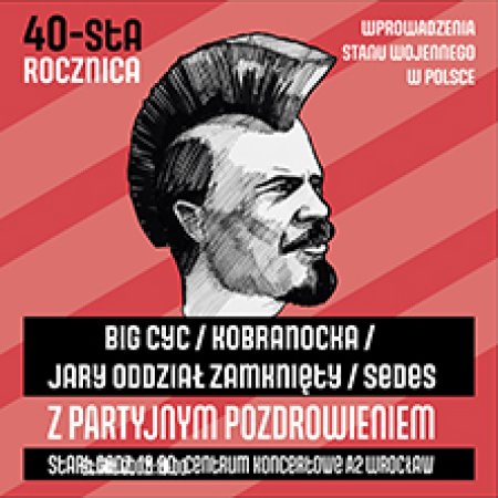 BIG CYC legenda polskiego punk rocka zaprezentuje materiał ze swojej debiutanckiej płyty Z partyjnym pozdrowieniem. Wizerunek Lenina z irokezem na okładce, album będący rockandrollową beczką śmiechu dał BIG CYCowi przepustkę do sal koncertowych i festiwali w całej Polsce.