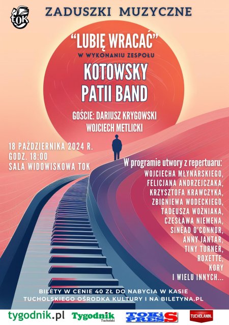 Jesienna aura nastraja do posłuchania nostalgicznej muzyki… Zapraszamy na koncert Zaduszki Muzyczne pt. „Lubię wracać”, który odbędzie się w piątek 18 października o godz. 18.00. Bilety w cenie 40 zł do nabycia w sekretariacie TOK oraz przez portal biletyna.pl.