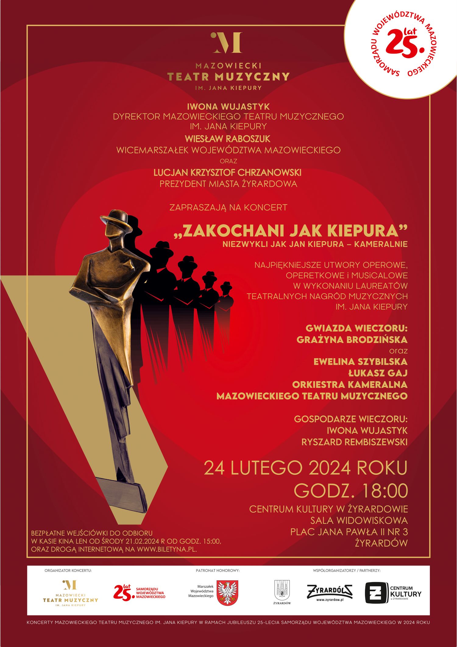 24 lutego o godz. 18.00 serdecznie zapraszamy Żyrardowian do wysłuchania koncertu "Zakochani jak Kiepura"- „Niezwykli jak Jan Kiepura - kameralnie - najpiękniejsze utwory operowe, operetkowe i musicalowe w wykonaniu laureatów Teatralnych Nagród Muzycznych im. Jana Kiepury”.