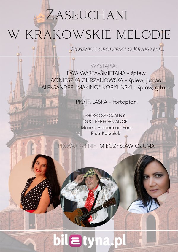 Wyjątkowy koncert podczas, którego usłyszą Państwo piosenki i opowieści związane z pięknym miastem Królów Polski - Krakowem! W koncercie udział wezmą artyści związani na co dzień ze stolicą Małopolski: Aleksander "Makino" Kobyliński, Ewa Warta-Śmietana oraz Agnieszka Chrzanowska. Przy fortepianie wystąpi Piotr Laska. Koncert wzbogaci wyjątkowy gość specjalny - zespół Duo Performance (Monika Biederman- Pers, Piotr Karzełek). Koncert poprowadzi Mieczysław Czuma.