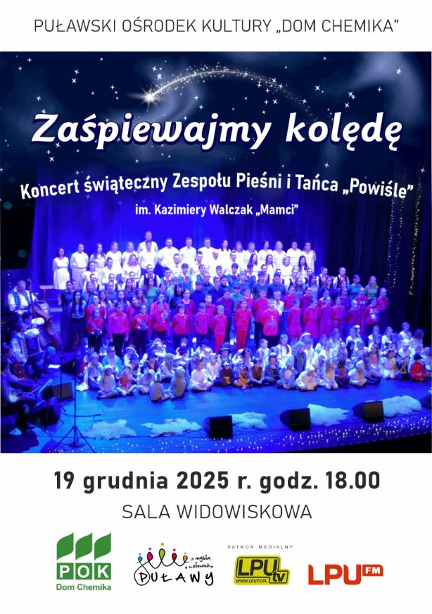 Zbliżają się najpiękniejsze święta roku, a wraz z nimi magiczny czas kolędowania! Z tej okazji zapraszamy wszystkich miłośników tradycji, muzyki i świątecznego klimatu na wyjątkowy koncert pt. "Zaśpiewajmy kolędę" w wykonaniu Zespołu Pieśni i Tańca "Powiśle" im. Kazimiery Walczak "Mamci".
