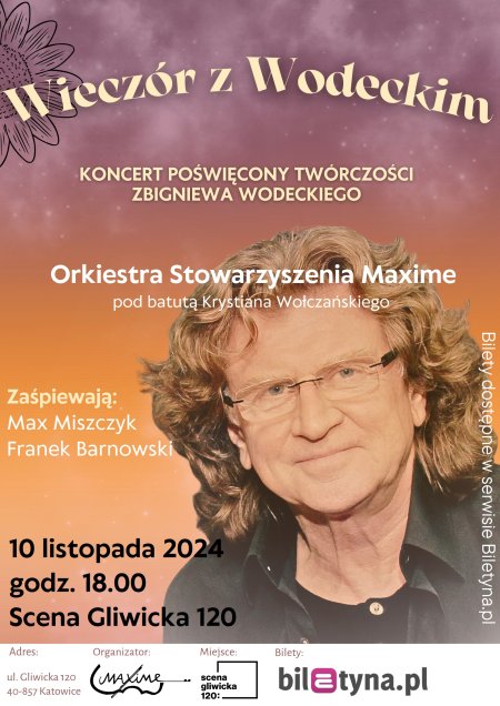 Stowarzyszenie Maxime zaprasza na niezwykły muzyczny wieczór dedykowany twórczości Zbigniewa Wodeckiego w wyjątkowym miejscu - Scenie Gliwickiej 120 w Katowicach, który odbędzie się 10 listopada o godzinie 18.00. W magiczną podróż przez najpiękniejsze utwory Zbigniewa Wodeckiego zabiorą nas: Max Miszczyk - uczestnik 14 edycji the Voice of Poland oraz Franek Barnowski - zwycięzca Szansy na Sukces, a zagra dla Państwa niezawodna Orkiestra Maxime pod batutą Krystiana Wołczańskiego - gwarantująca niezapomniane doznania muzyczne. W programie usłyszymy zarówno największe przeboje, jak i mniej znane, ale równie piękne kompozycje. To wydarzenie to doskonała okazja, aby na nowo odkryć magię muzyki Wodeckiego, w wykonaniu znakomitych artystów. Dołącz do nas i przeżyj niezapomniany wieczór pełen muzyki, emocji i wspomnień.
