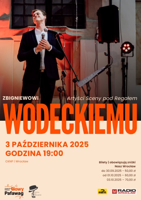 Scena pod Regałem działa od 2017 roku w sercu Wrocławia, kierowana przez Michała Hadasika, od lat rozwija kontekstowy przekaz muzyczny, oparty na przemyślanych aranżacjach i emocjonalnej wrażliwości, promuje młodych i kreatywnych wykonawców, wyłamujących się z szeregu dzięki literackiej piosence, poezji śpiewanej, wieczorom jazzowym i kulturom muzycznym świata. Wokalne interpretacje Jakuba Luboińskiego, jego saksofonowe frazy i prowadzenie koncertu to serce tego wydarzenia, które w towarzystwie Michała Hadasika na fortepianie, Żeni Betlińskiego na kontrabasie i pełnego energii Mateusza Maniaka przy perkusji tworzą wspólnie przestrzeń, gdzie muzyka Wodeckiego płynie od serc aż po brzmieniowe niuanse.