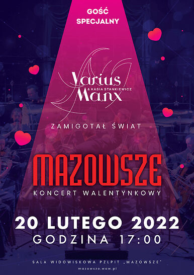 Jeśli walentynki, to tylko z "Mazowszem"! Zaprosiliśmy do wspólnego koncertu zespół Varius Manx, którego piękne liryczne piosenki towarzyszyły niejednemu z nas, podczas rodzenia się i dojrzewania miłości życia.Tym razem na jednej scenie - Varius Manx i "Mazowsze" wykonają najpiękniejsze najbardziej znane przeboje z repertuaru obu zespołów. Takiej okazji nie można przegapić!