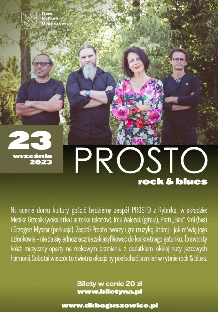 Sobota wieczór to świetna okazja by posłuchać brzmień w rytmie rock & blues! Na scenie domu kultury gościć będziemy zespół PROSTO z Rybnika.