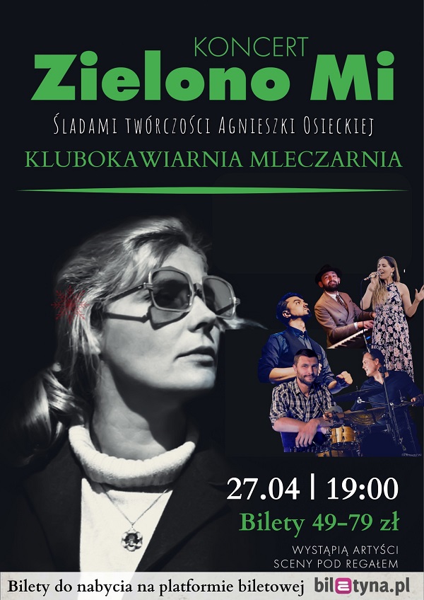 Koncert “Zielono Mi - Ważne Piosenki || Śladami Agnieszki Osieckiej & przyjaciół ” to wyjątkowy recital nacechowany sentymentalną podróżą po meandrach twórczości mistrzyni, w czasie którego przypomnimy nie tylko wielkie przeboje polskiej estrady z jej tekstami, ale również opowiemy Wam kilka ciekawostek i anegdot z jej życia i pracy twórczej.