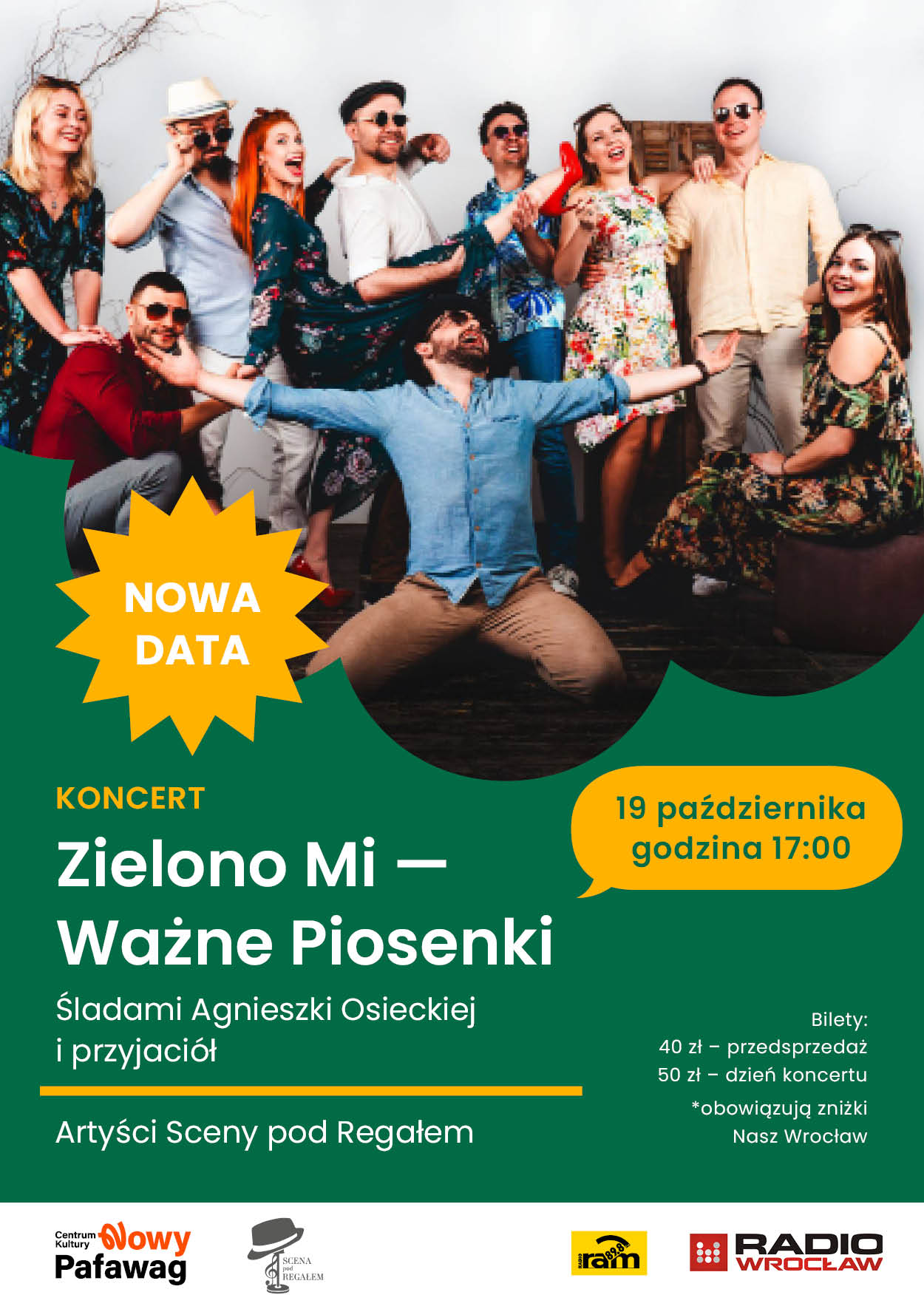 Koncert „Zielono Mi - Ważne Piosenki - Śladami Agnieszki Osieckiej i przyjaciół ” to wyjątkowy recital nacechowany sentymentalną podróżą po meandrach twórczości mistrzyni, w czasie którego przypomnimy nie tylko wielkie przeboje polskiej estrady z jej tekstami, ale również opowiemy Wam kilka ciekawostek i anegdot z jej życia i pracy twórczej.