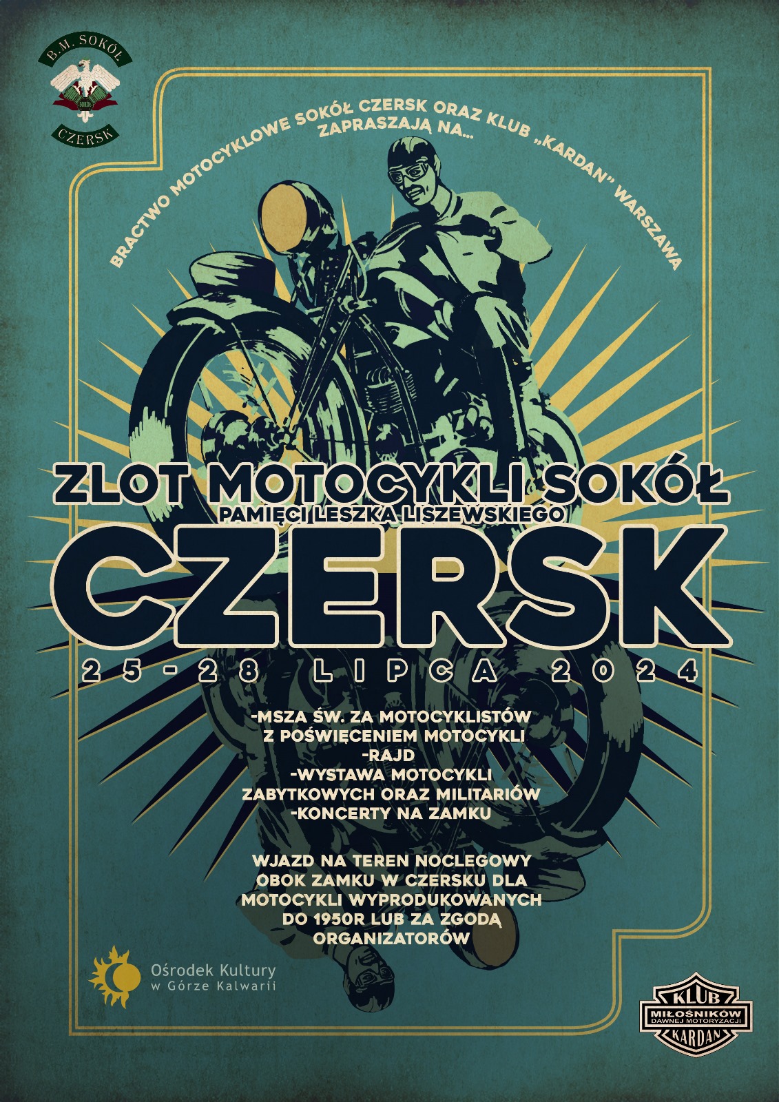 W imieniu Bractwa motocyklowego Sokół Czersk oraz Klubu Miłośników Dawnej Motoryzacji Kardan zapraszamy na zlot motocykli Sokół, pamięci Leszka Liszewskiego, który odbędzie się w Czersku dniach 26-27 lipca 2024 na zamku w Czersku.