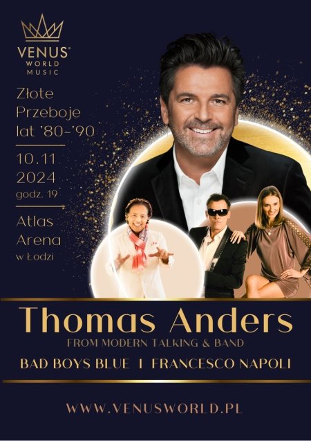 Podczas tego wyjątkowego koncertu, oprócz Thomasa Andersa, na scenie pojawią się także Bad Boys Blue oraz Francesco Napoli. Przygotujcie się na wieczór pełen złotych przebojów, które przeniosą Was w czasie do lat '80 i '90, kiedy to euro disco i dance pop królowały na parkietach.