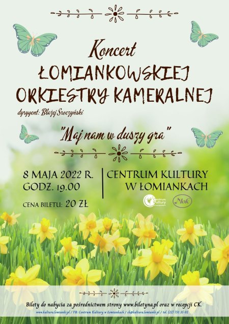 Bez wątpienia majowy koncert Łomiankowskiej Orkiestry Kameralnej pod bautą Błażeja Sroczyńskiego, wprawi każdego w iście wiosenny nastrój, którego efektem będzie doskonałe samopoczucie po jego zakończeniu. Gwarantujemy, że ten stan psychiczny i fizyczny zostanie z Wami jeszcze długo po koncercie, na ktory serdecznie zapraszamy.