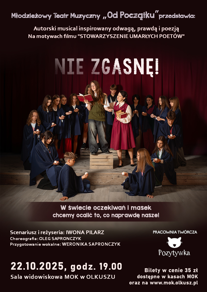 Młodzieżowy Teatr Muzyczny Od Początku od czterech lat tworzy autorskie produkcje, które zdobywają uznanie za szczerość, pasję i profesjonalizm. „Nie zgasnę!” jest najnowszym, najbardziej dojrzałym projektem grupy zrealizowanym przez Pracownię Twórczą Pozytywka w Olkuszu.