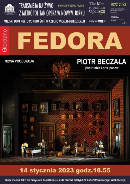 W roli zbrodniarza, Lorisa Ipanowa, wystąpi tenor Piotr Beczała. Zobaczymy także sopranistkę Rosę Feolę w roli hrabiny Olgi, powiernicy Fedory oraz barytona Artura Rucińskiego jako dyplomatę De Siriexa. Atutem inscenizacji jest wyjątkowa scenografia, która ukaże m.in. pałac w Petersburgu, modny paryski salon i willę w szwajcarskich Alpach. Spektakl reżyseruje David McVicar. Orkiestrę Met poprowadzi Marco Armiliato.