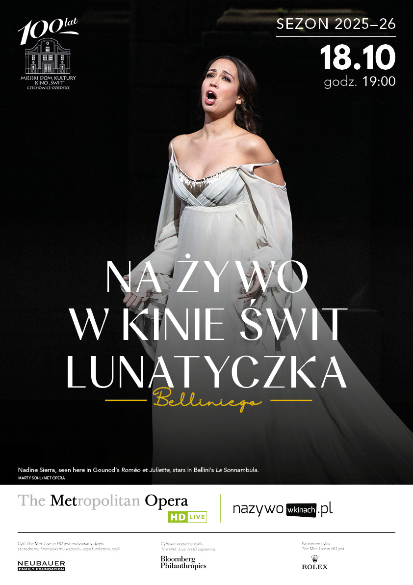 W swojej nowej inscenizacji Rolando Villazón – tenor, który z powodzeniem rozwija karierę reżyserską – pozostaje wierny oryginalnemu alpejskiemu krajobrazowi, ale wykorzystuje motyw snu do głębszej eksploracji emocjonalnych i psychologicznych zakamarków ludzkiego umysłu. Obok Nadine Sierry na scenie wystąpią: tenor Xabier Anduaga jako narzeczony Aminy, Elvino, sopranistka Sydney Mancasola w roli jej rywalki Lisy oraz bas Alexander Vinogradov jako hrabia Rodolfo. Za pulpitem dyrygenckim stanie Riccardo Frizza. Jedno z najbardziej zachwycających dzieł operowych zostanie zaprezentowane na żywo z Metropolitan Opera w kinach na całym świecie już 18 października 2025 roku.