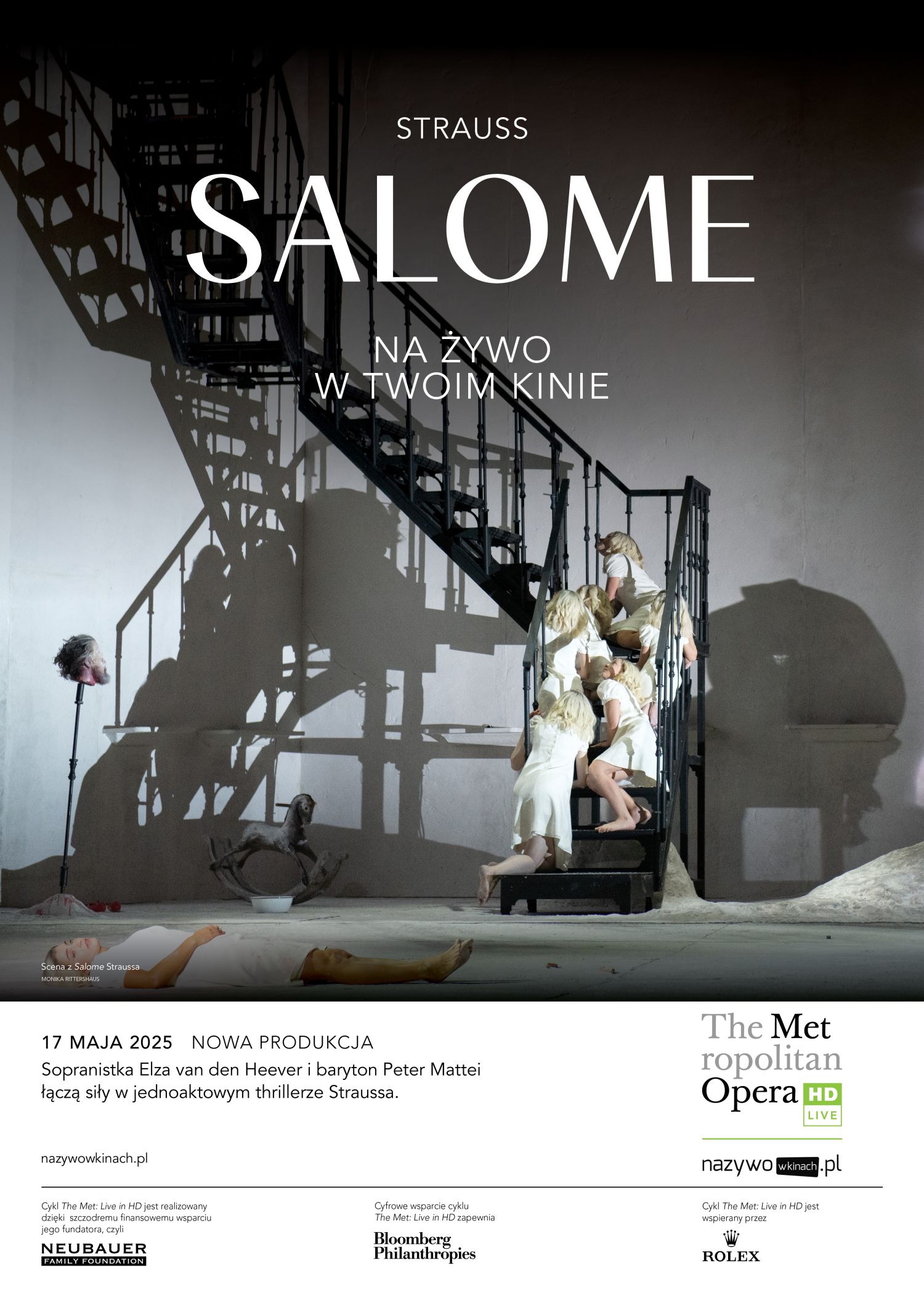Jeden z czołowych reżyserów operowych w Europie, Claus Guth, przedstawia pierwszą od dwudziestu lat nową inscenizację Salome w The Metropolitan Opera, nadając biblijnej opowieści psychologiczną oprawę epoki wiktoriańskiej. Sopranistka Elza van den Heever przewodzi gwiazdorskiej obsadzie jako udręczona i niezrównoważona antybohaterka. U jej boku wystąpią: baryton Peter Mattei jako zniewolony prorok Jokanaan, tenor Gerhard Siegel jako lubieżny ojczym Salome, Herod, mezzosopranistka Michelle DeYoung jako jego żona, Herodiada, i polski tenor Piotr Buszewski jako Narraboth.