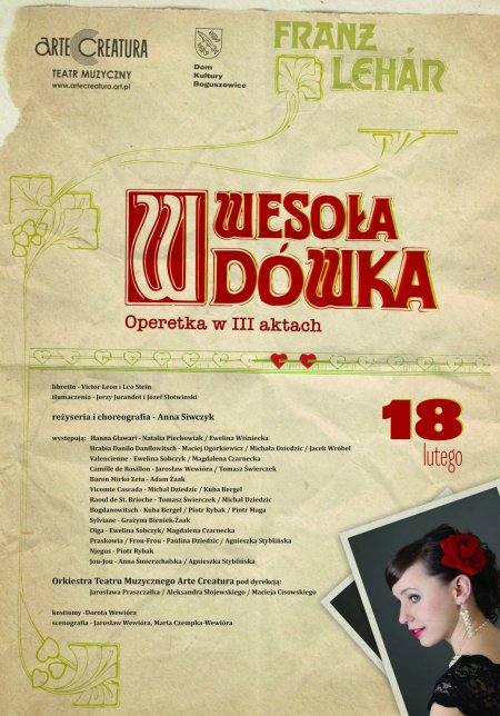 Na scenę DK Boguszowice powraca operetka w najlepszym wydaniu! Wesoła wdówka Franza Lehára z roku 1905 odniosła ogromy sukces i okrzyknięto ją arcydziełem gatunku. Uznawana jest za najlepszą i najczęściej graną operetkę, przepełnioną szlagierami na czele z największym bodaj hitem scen operetkowych Usta milczą, dusza śpiewa.