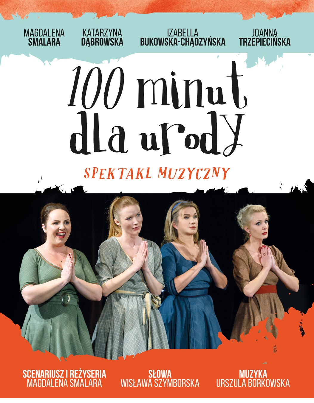“100 minut dla urody” czyli poezja Wisławy Szymborskiej w służbie kobiecości. Muzyczny spektakl, pełen humoru i wdzięku, oparty na wierszach Noblistki opowiada o życiu, tęsknotach, dociekaniu Prawdy i Piękna, z właściwą poetce serdeczną ironią. Muzyka Urszuli Borkowskiej rozpisana na aktorski czterogłos wydobywa rytm i rym poezji Szymborskiej i sprzyja uwadze widzów. Izabella Bukowska – Chądzyńska, Katarzyna Dąbrowska, Joanna Trzepiecińska i reżyserka Magdalena Smalara tworzą idealnie zestrojony kwartet, ale każda z nich ma też partie solowe. Wiersze znane i mniej znane oraz fragmenty “Lektur Nadobowiązkowych” składają się na trochę więcej niż 100 minut, 100 minut dla umysłu i serca; tak mało w naszym życiu jest poezji, a przecież tak przyjemnie jest się w niej zanurzyć.