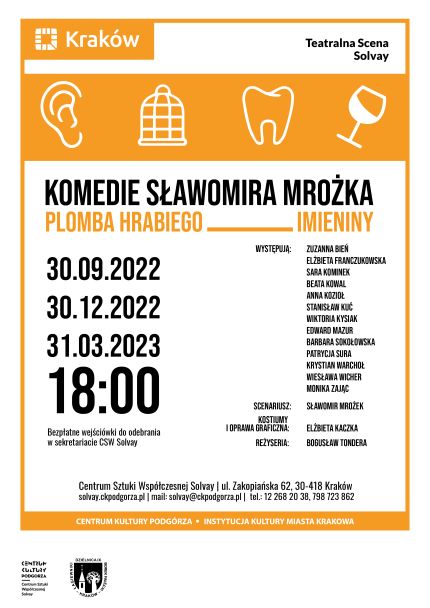 „Imieniny” i „Plomba Hrabiego” (premiera 05.06.2022) to dwie jednoaktowe sztuki napisane przez Sławomira Mrożka. Opowiadają – na wesoło – o zwykłych wydarzeniach życiowych, także z wątkiem kryminalnym, ukazanych w groteskowej perspektywie. Przygotowano do nich specjalną oprawę plastyczną – grafiki i kostiumy, których autorką jest Elżbieta Kaczka. Reżyserował Bogusław Tondera, czeski reżyser znany głównie na Słowacji, który świetnie oddał w swojej inscenizacji polskiego, krotochwilnego ducha.