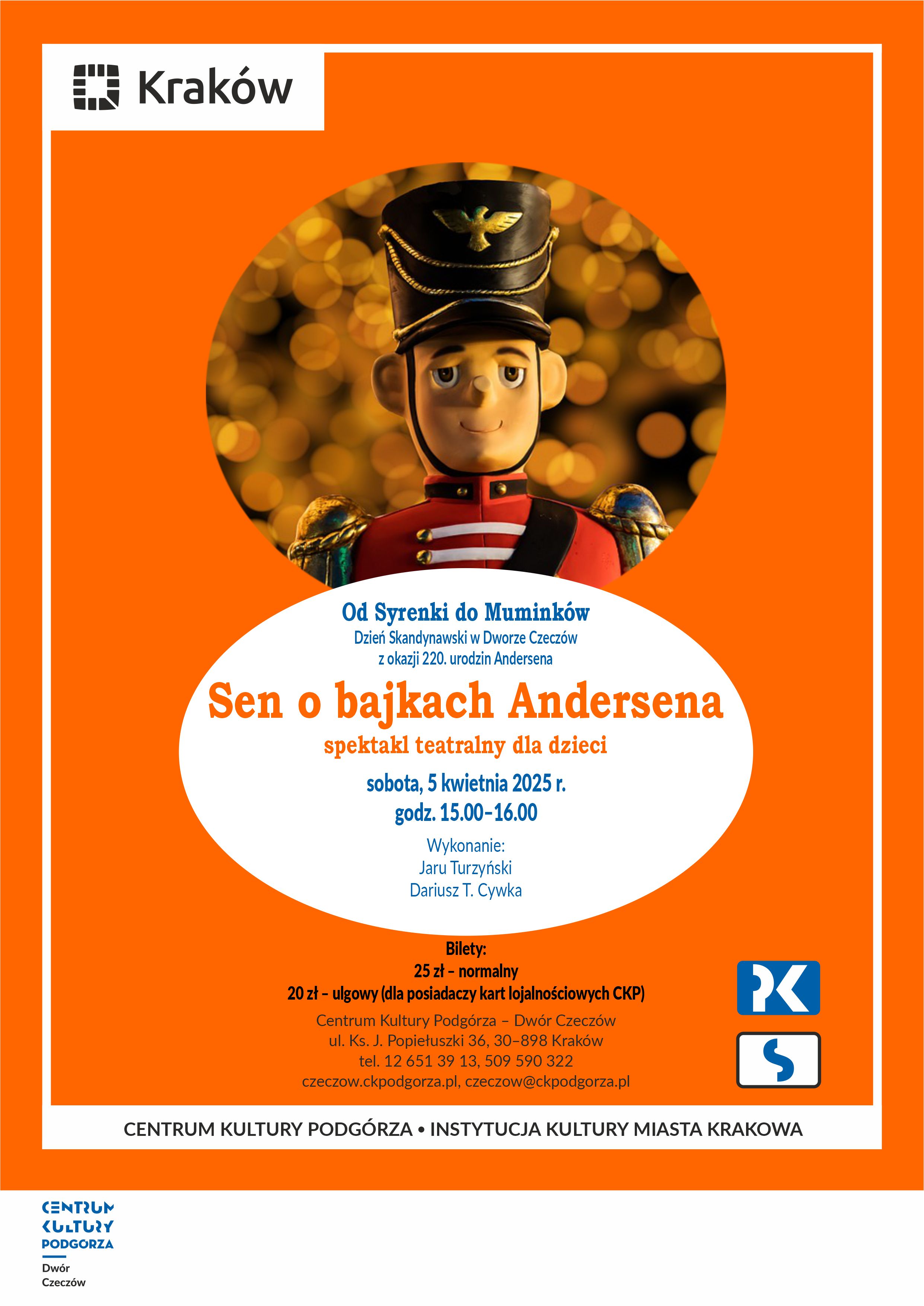 Zapraszamy na spektakl teatralny dla dzieci pt. "Sen o bajkach Andersena", który odbędędzie się w ramach Dnia Skandynawskiego z okazji 220. urodzin Andersena , w sobotę 5 kwietnia 2025 roku o godz. 15.00 w Dworze Czeczów.