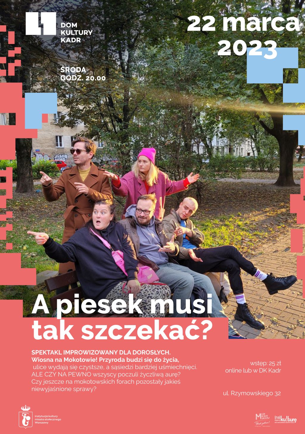 Zapraszamy na kolejny przegląd mokotowskich awantur i absurdów, które absurdy będą inspiracją do improwizowanych scen. To wydarzenie komediowe łączące spektakl z interakcją z publicznością. Chcemy spojrzeć na lokalne problemy z przymrużeniem oka. Przypomnimy najbardziej spektakularne dramy, ale też dla równowagi – chwile, kiedy mokotowski Facebook był krainą życzliwości i miłości. A co zobaczycie na scenie? Kulisy lokalnych kłótni, dalsze perypetie bohaterów albo absurdalne rozwiązania zgłaszanych problemów.