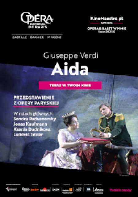 Wystawienie „egipskiej” opery Verdiego to zawsze wielkie wyzwanie dla inscenizatorów. Tym razem Lotte de Beer, holenderska reżyserka, proponuje pokazanie historii tragicznej miłości etiopskiej niewolnicy Aidy i wodza wojsk egipskich Radamesa w murach francuskiego muzeum czasów fin de siècle’u. Zwiedzający wystawę, poprzez podziwianie egipskich eksponatów, odkrywają historię, która wydarzyła się tysiące lat temu. Rolę Aidy wykonuje Sondra Radvanovsky, słynna amerykańsko-kanadyjska sopranistka, która specjalizuje się w operach Verdiego i Pucciniego. Jej ukochanym Radamesem jest jeden z najlepszych obecnie tenorów świata – Jonas Kaufmann.