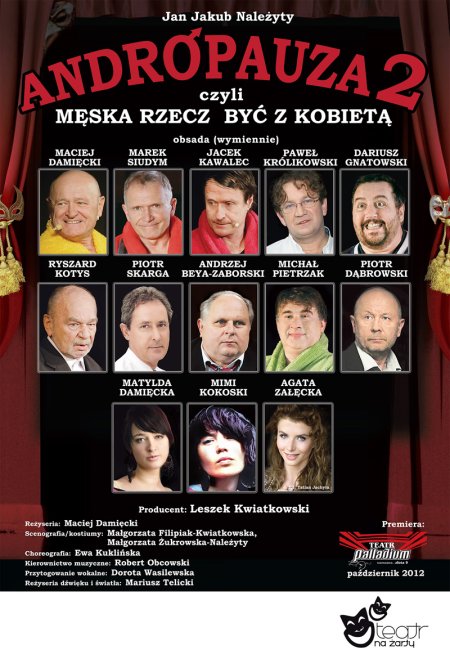Andropauza 2 męska rzecz być z kobietą, problem pojawia się wtedy kiedy ona jest jedna, a ich pięciu. Zakończenie będzie szczęśliwe. Dla kogo? O tym będziecie mogli przekonać się Państwo sami, bo wojna płci jest odwieczna i w Pesel nie zagląda. Dlatego sztukę dedykujemy Widzom w każdym wieku. Sztuka w gwiazdorskiej obsadzie.