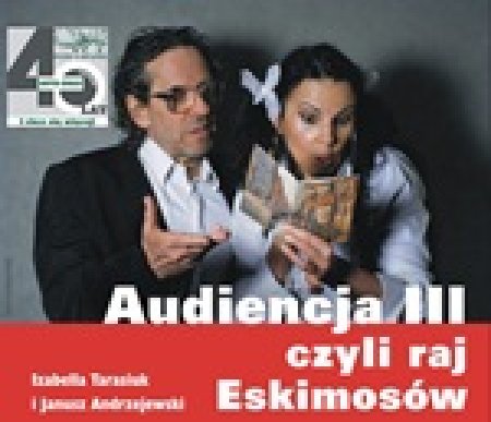 **"Audiencja III czyli raj Eskimosów" - BOGUSŁAW SCHAEFFER - spektakl w wykonaniu Janusza Andrzejewskiego i Izabelli Tarasiuk Audiencja III to zaskakująca opowieść o spotkaniu dwojga ludzi (Ona gra na fortepianie, On na wiolonczeli). Spotkaniu interesującym, bo zmiennym, tworzącym różne nastroje i relacje - jak to u Shaeffera. Nic tam nie jest stałe, wszystko jest zmienne, płynne i kontrastowe. Zawsze wielostronne, bo jednostronne mogą być tylko plakaty i tapety. Konstrukcja Shaefferowskiej** audiencji jak zawsze zaczyna się od wykładu o muzyce, który przekształca się w wariację.