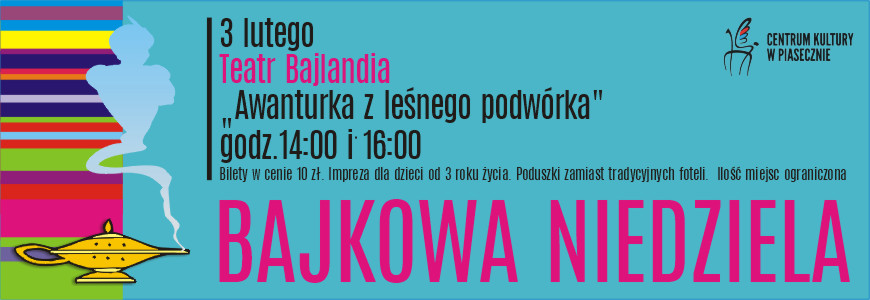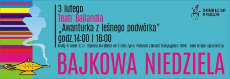 BAJKOWA NIEDZIELA, czyli cykl spektakli dla dzieci w wieku przedszkolnym i ich rodziców. Podczas najbliższej niedzieli wystąpi Teatr Bajlandia, który zaprezentuje swój spektakl pt.: "Awanturka z leśnego podwórka".