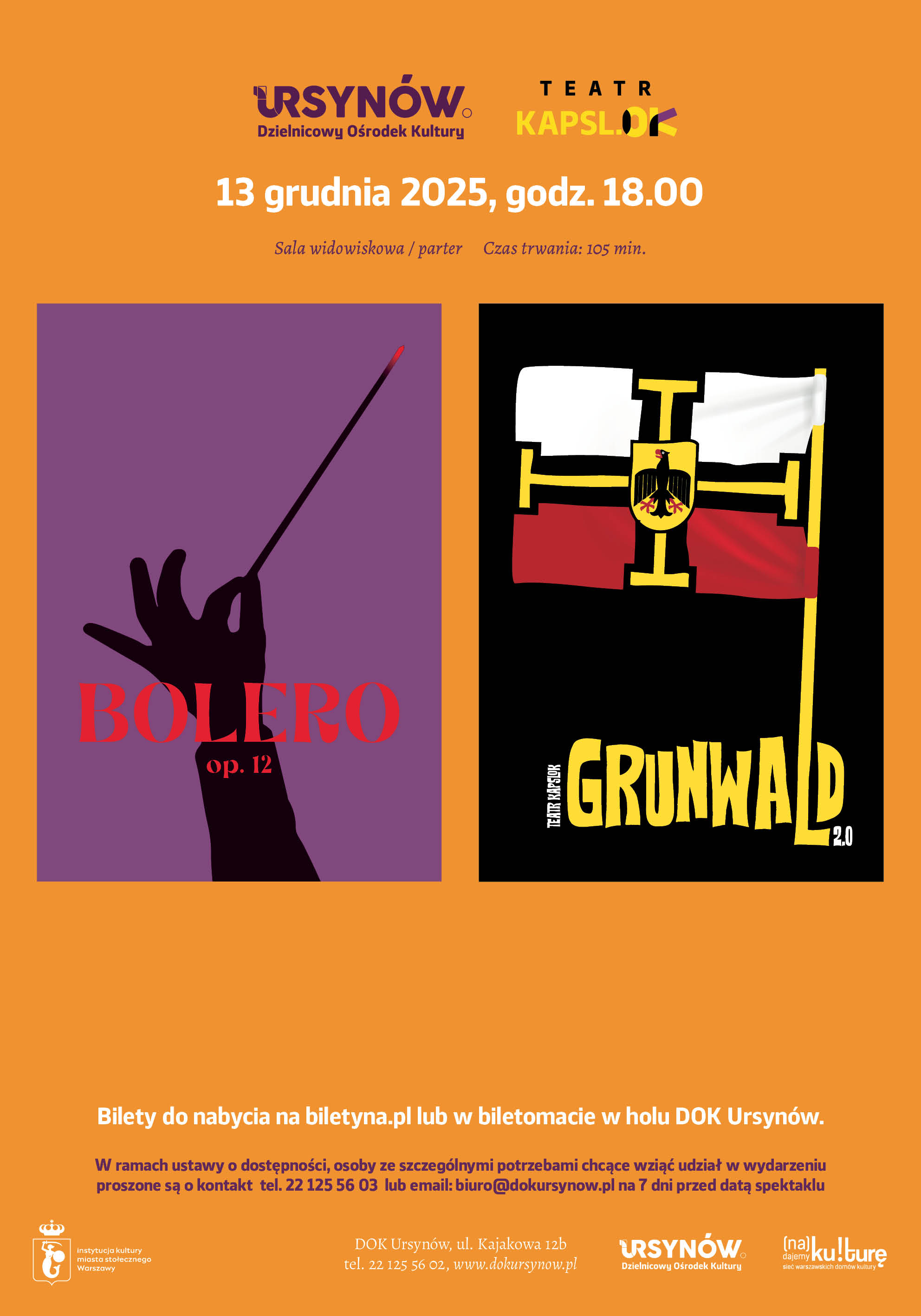 "BOLERO op.12" i "GRUNWALD 2.0" to komediowo-groteskowy wieczór złożony z dwóch jednoaktówek autorstwa Grzegorza Reszki zrealizowane przez zespół Teatru Kapslok.