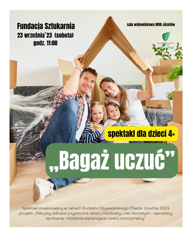 Jak pomóc dzieciom radzić sobie z emocjami? Jak wprowadzać dziecko w świat emocji? My nazywamy je po imieniu! W trakcie spektaklu teatralnego zapraszamy dzieci do zadawania pytań i dajemy im szansę na zrozumienie tego, co im się przytrafia. Jaki wpływ ma rodzic na to, jak przeżywa emocje dziecko? Czy my dorośli, też możemy się czegoś nauczyć? Wspólnie zastanowimy się również, jak w poszczególnych kulturach odczytywane są znaki ciała, jakie ograniczenia w okazywaniu emocji funkcjonują w innych częściach świata i czy emocje są uniwersalne. Razem wyruszymy w wyjątkową podróż, zabierając ze sobą bagaż emocji. Przekonamy się, czy jest on nieznośnym ciężarem, czy może ekwipunkiem niezbędnym podczas wędrówki jaką jest życie.