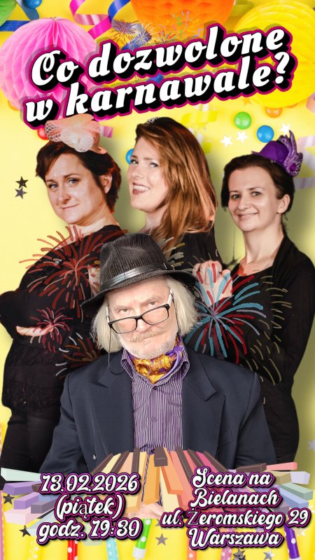 Gdzie i jak spędzić karnawał? Co tak naprawdę jest wtedy dozwolone i co jeśli np. do naszego zaplanowanego wyjścia dołączy teściowa albo szef z pracy? A co się stanie, jeśli w drodze na karnawałową imprezę utkniemy w składziku na szczotki, w uberze lub też w windzie i jak poradzą z tym sobie nasi bohaterowie? "Co dozwolone w karnawale?" - to spektakl komediowy improwizowany na żywo, który powstaje na oczach widzów, dzięki ich sugestii. Publiczność ma niepowtarzalną okazję uczestniczyć w tworzeniu przez aktorów zabawnej fabuły. Stworzymy spektakl, który pokaże nam co można wyczyniać w okresie karnawałowym, by nie było zbyt banalnie... O przebiegu akcji, losach bohaterów, decydują widzowie! Wspaniała zabawa gwarantowana! Zapraszamy na niepowtarzalny, improwizowany spektakl z towarzyszeniem muzyki na żywo! Uwaga! Nie wyciągamy widzów na scenę! Tytuł grany po raz ostatni w tym sezonie!