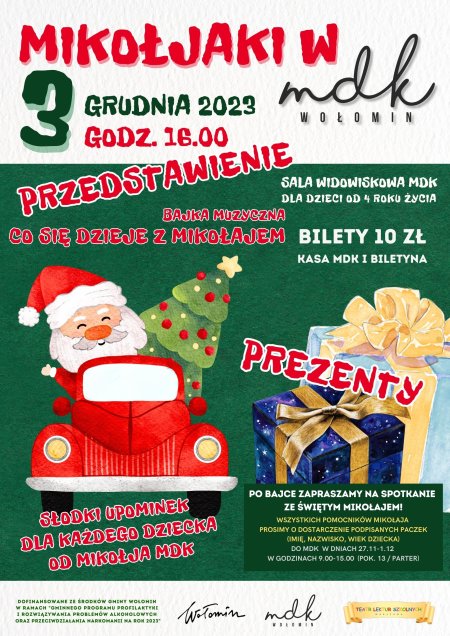 W niedzielę 3 grudnia o godzinie 16:00 zapraszamy wszystkie dzieci w wieku 4+ na mikołajkowe świętowanie w Miejskim Domu Kultury w Wołominie.