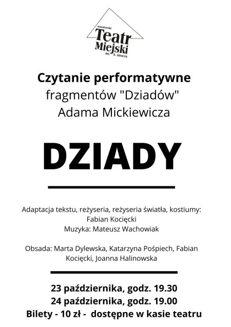 Czytanie performatywne fragmentów "Dziadów" Adama Mickiewicza. Adaptacja tekstu, reżyseria, światła, kostiumy: Fabian Kocięcki. Obsada: Marta Dylewska, Katarzyna Pośpiech, Fabian Kocięcki, Szymon Roszak.