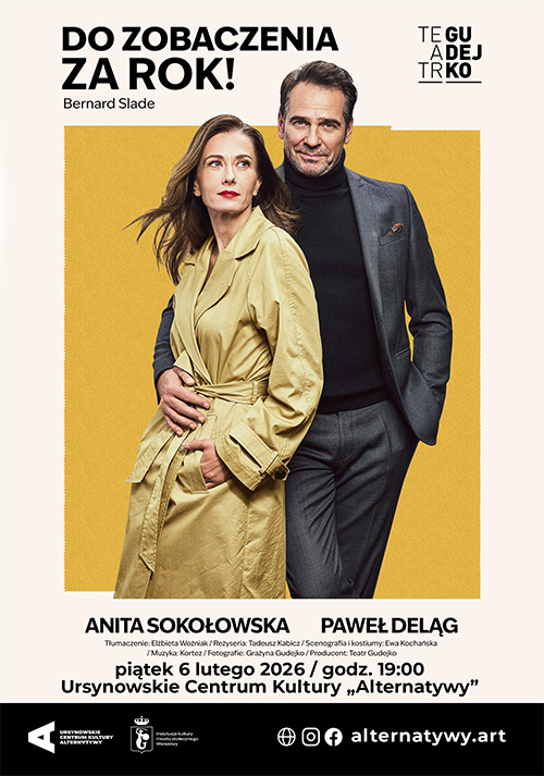Niezwykła miłość z datą w kalendarzu. Spotkanie raz w roku, a emocji na całe życie. „Do zobaczenia za rok” to współczesna, polska wersja amerykańskiej sztuki „Same Time, Next Year”, pełna humoru i wzruszeń opowieść o wyjątkowej więzi dwojga ludzi. Jola (Anita Sokołowska) i Jurek (Paweł Deląg) poznają się przypadkiem w pensjonacie i – mimo że oboje mają rodziny – spędzają razem noc, a następnego dnia postanawiają spotykać się w tym samym miejscu, o tej samej porze, każdego roku. Przez kolejne dziesięciolecia śledzimy ich coroczne spotkania, które stają się zwierciadłem zmieniających się czasów, poglądów i życiowych wyborów, a zabawne dialogi przeplatają się z momentami głębokiej refleksji, podczas gdy relacja bohaterów – niepozorna i zakazana – dojrzewa, stając się symbolem przyjaźni, miłości i ludzkiej potrzeby bliskości. Spektakl zachwyca inteligentnym humorem, ciepłem i nostalgicznym spojrzeniem na ludzkie losy, tworząc historię, która bawi, wzrusza i skłania do zadania sobie pytania: czy miłość ma swój czas i miejsce?