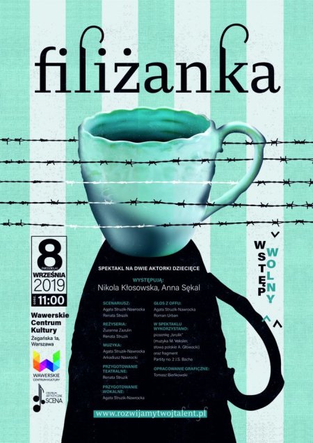 Tegoroczny sezon teatralny w Wawerskim Centrum Kultury otwieramy niezwykłym spektaklem "Filiżanka", który prezentowany jest w ramach Festiwalu Warszawa Singera. Zapraszamy starsze dzieci (od lat 8) i młodzież do obejrzenia wzruszajacej historii przyjaźni Idy i Isrulika podczas II Wojny Światowej. Przedstawienie, które zdobyło juz wiele nagród i niezwykłą sympatię warszawskiej publiczności Teatru Kwadrat, powstało na podstawie scenariusza Renaty Struzik i Agaty Struzik-Nawrockiej.