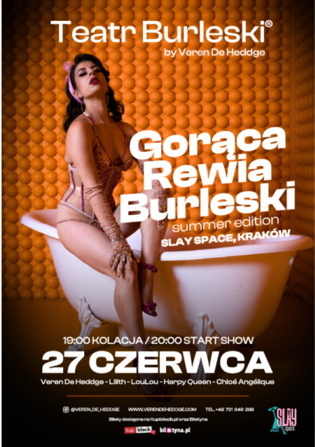Gorąca rewia burleski – program: - Burleska – i to w najznamienitszym wydaniu. Swoje show zaprezentuje Veren De Heddge, performerka znana w całej Polsce ze swojego kunsztu pracy. Jej show doceniła już publiczność na całym świecie. Jak pierwsza performerka z Polski, rozgrzała również do czerwoności scenę w RPA i USA. - Taniec – czymże byłoby lato bez tańca? Na scenie nie zabraknie niezwykłych akrobacji, które w okresie letnim przysporzą Wam najciekawszych wspomnień z wakacji. - Śpiew – podczas Gorącej Rewii Burleski – Summer Edition nie zabraknie również dreszczy na ciele, podczas słuchania wyjątkowego głosu Lilth. Z pewnością nie tylko odpłyniecie w krainę zapomnienia, ale również wprawicie ciało w taneczne rytmy. - Goście – obok Veren De Heddge, scenę rozpalą Harpy Queen oraz Chloé Angélique. Harpy Queen reprezentująca świat dragu zabierze widzów w wyjątkowy świat przepełniony emocjami. Charyzma artystki zawładnie Waszymi sercami i z pewnością wywoła gęsią skórkę. Zaś Chloé Angélique – subtelna performerka burleski, zaczaruje sensualnymi gestami, przekazując ruchem intrygujące historie.