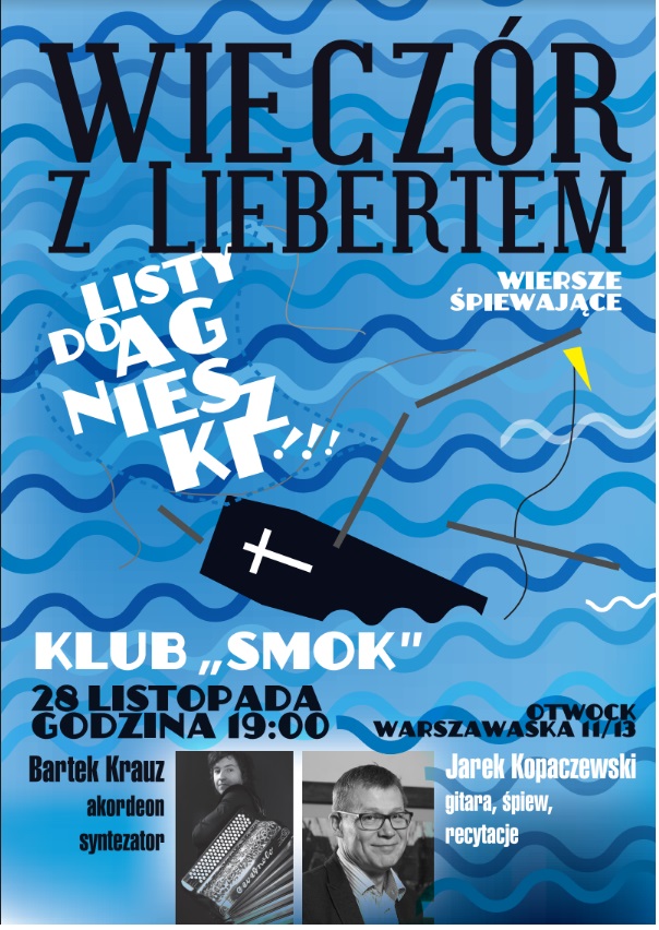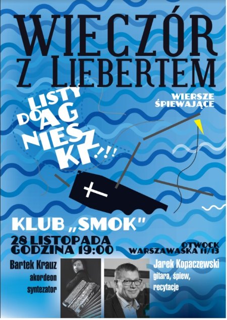 Spektakl jest próbą przybliżenia postaci Jerzego Lieberta- poety dwudziestolecia międzywojennego. Jest również próbą odpowiedzi na trudne pytania, które człowiek zadaje sobie w zyciu; jak żyć, aby nie stracić perspektywy celu, który chce się osiągnąć? Jak żyć, aby nie utracić siebie?Jerzy Liebert, poeta Skamandra, poeta czysty i prosty. Umarł bardzo młodo, w wieku 28 lat na gruźlicę. Wieczór z jego poezją, którą Jarosław Kopaczewski i Bartek Krauz wykonują w postaci songów oraz jego korespondencją do Agnieszki- jego wielkiej i niespełnionej miłości. Zapraszamy na interesujący spektakl w interpretacji Jarosława Kopaczewskiego.