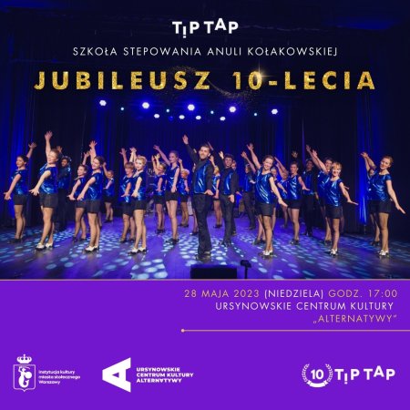 Pasja do stepowania, setki zadowolonych tancerzy oraz wiele sukcesów na mistrzostwach świata i Europy to znaki rozpoznawcze założonej przez Anulę Kołakowska Szkoły Stepowania Tip Tap. Z okazji jej 10. urodzin odbędzie się wyjątkowy i pełen atrakcji występ. Na scenie pojawią się zaproszeni specjalnie na tę okazję goście, wielokrotni mistrzowie świata w stepowaniu: Daniel Borak (Szwajcaria) oraz bracia Leonardo i Emanuele D’Angelo (Włochy). Wydarzenie uświetnią także zaprzyjaźnione szkoły tańca: MyTap z Krakowa, Wrocławska Szkoła Stepowania i Swing Avenue z Warszawy. Podczas wydarzenia nie zabraknie występu tych, którzy od 10 lat tworzą historię i wspaniałą atmosferę Tip Tap – utalentowanych instruktorów oraz uczniów szkoły. Wieczór pełen emocji i tańca upłynie przy akompaniamencie zespołu jazzowego.