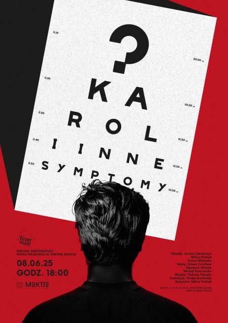 Uniwersalna i wielowymiarowa twórczość Sławomira Mrożka jest dla Miłosza Pańtaka (reżysera) ponadczasowa. Zamiast sięgać po jak sam twierdzi oklepane i grane wszędzie „Tango” zdecydował, że na warsztat weźmie utwór mniej znany. Kameralny charakter „Karola” to świat relacji międzyludzkich w miniaturze. Pewny siebie, prosty a czasem i prostacki młody człowiek (brawurowo wykreowany przez Jordana Jakubiszyna) przyprowadza do gabinetu okulistycznego swojego dziadka celem dobrania odpowiednich okularów. Ich spotkanie z przymilnym acz przeświadczonym o własnej wyższości okulistą (w tej roli debiutujący Tymon Wieteska) przybierze nieoczekiwany obrót, kiedy to okaże się, że dziadzio miast trzymać w dłoni laseczkę czy parasol dzierży w swoim żelaznym uścisku strzelbę. Aktorzy prócz wspomnianej jednoaktówki wykonają trzy monologi, które będą wpisywały się w dyskusję o kondycji współczesnego człowieka zapoczątkowaną w Karolu. Ten krótki spektakl grupy Sinobrody pozostawi mamy nadzieję Państwa z pytaniem: „czym jest i komu z nas nie obca jest dziś idea karolostwa?”
