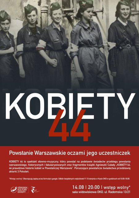 KOBIETY 44 to montaż słowno-muzyczny w reżyserii Dominiki Ostałowskiej, który powstał na podstawie świadectw przebiegu powstania warszawskiego, historycznych i fabularyzowanych oraz fragmentów książki Agnieszki Cubały „KOBIETY'44. 44 prawdziwe historie kobiet w Powstańczej Warszawie”. Poruszające powstańcze świadectwa przedstawią aktorki 3 Pokoleń: Ewa Dałkowska, Aleksandra Justa, Zuzanna Saporznikow, Jadwiga Jankowska - Cieślak, Dominika Ostałowska, Karolina Brodacka. Słowo dopełni muzyka na żywo w opracowaniu Mateusza Dębskiego i w wykonaniu Małgorzaty Kozłowskiej, która zaśpiewa utwory oparte na poezji Anny Świrszczyńskiej. Powstańczym życiorysom towarzyszyć będą projekcje multimedialne, powstałe na podstawie archiwaliów.