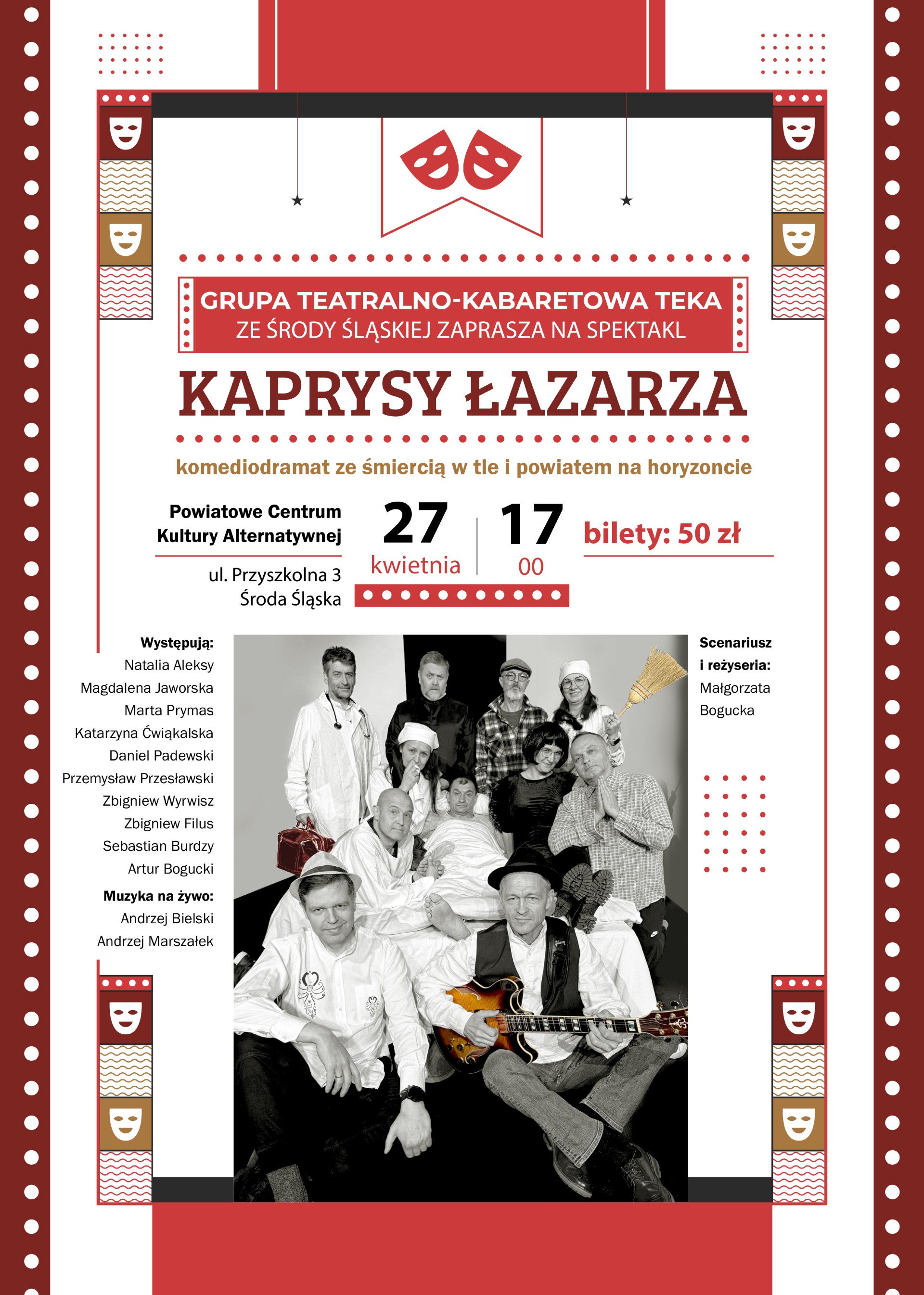 Komediodramat ze śmiercią w tle i powiatem na horyzoncie w reżyserii Małgorzaty Boguckiej, w wykonaniu grupy Teatralno-Kabaretowej TeKa z CeKA, z muzyką na żywo.